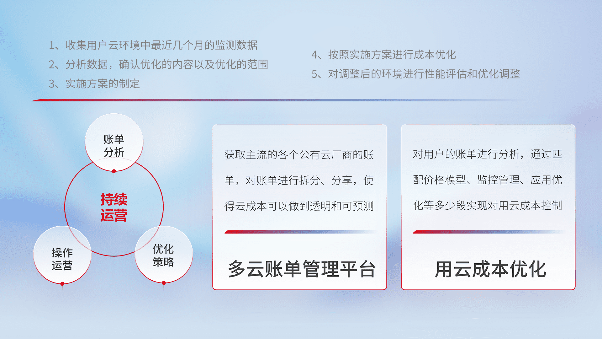 通过多云纳管,,,,以统一的资源数据模型把客户的云资源进行抽象和封装,,进而实现对多云资源的统一操作,,,,保障云资源管理的可靠性、、、稳定性与可用性。。。量身定制化运维内容,,配置、、开发运维、、、、补丁管理、、备份、、、、监控、、、认证和访问管理、、、、审计和日常巡检等,,保障在用云过程中的可靠度,,,,稳定度以及高可用率。。